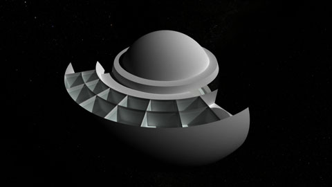 Il Teatro Spaziale può viaggiare sospeso a gravità zero in un punto a 36.000 km sopra la Terra. In questo caso la sua velocità è pari alla velocità di rotazione della Terra.